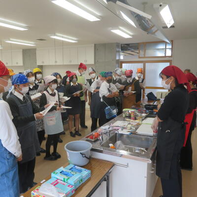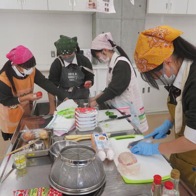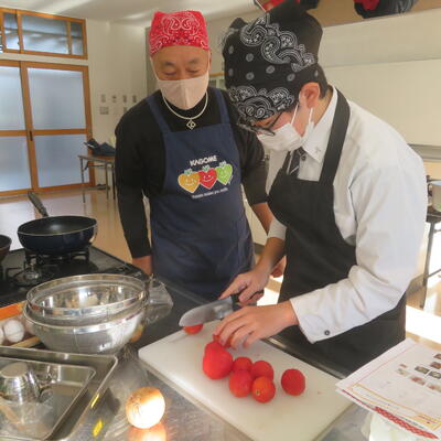今年度は、2年生40名が、ご提供いただいた加工用トマト苗(品種名:「リリコ」)を5月に定植しました。7月から8月にかけて収穫し、冷凍保存してきたトマトを、12月10日(水)の調理実習で活用することとなりました。
