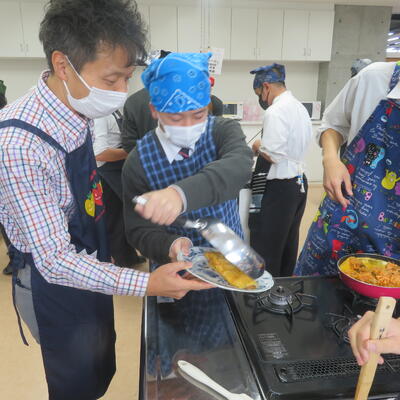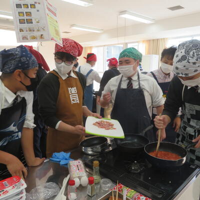 その後、生徒たちは1班4名のグループに分かれて調理を開始。各調理台には社員の方々がついてくださり、親切かつ丁寧なアドバイスをいただきながら、時には励ましの言葉もかけていただき、和やかな雰囲気の中で実習が進みました。