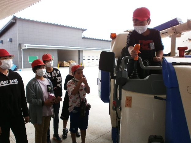 稲刈り最終日には高舘小学校の5年生がイネの刈り取り・乾燥・調整の仕組みを学習するため来校しました。大半の児童がコンバインに触れたことがないことから、乗車して運転席の高さに驚いていました。