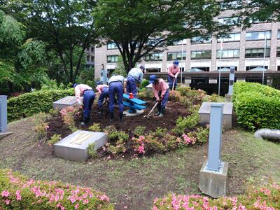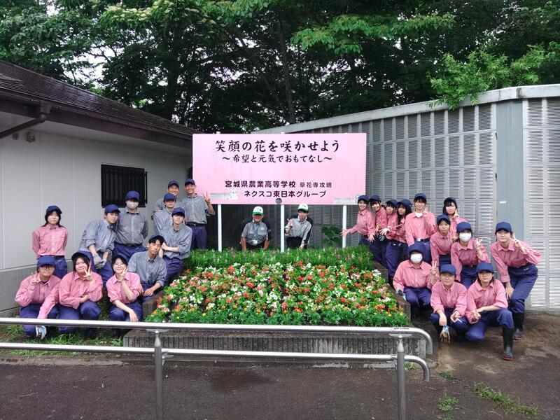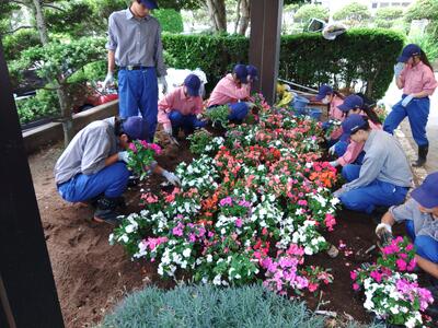 草花部門では毎年、宮城県庁花時計・仙台国際空港・山田IC・宮城県立精神医療センターの花壇で、年2~3回植栽を実施しています。本年度は6月4日の県庁を皮切りに6月25日の山田ICまで、4カ所で夏季植栽実習を無事に終えることができました。