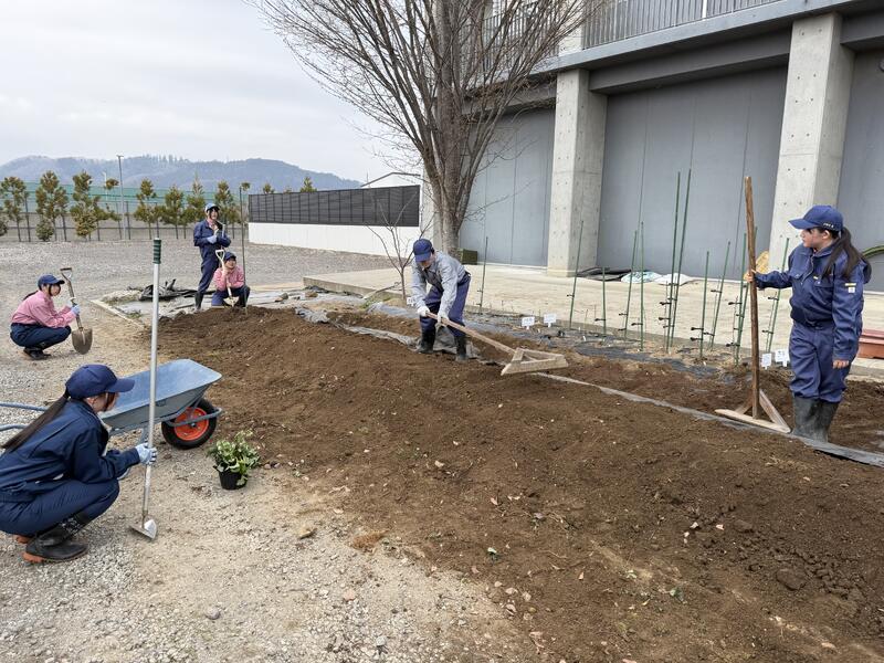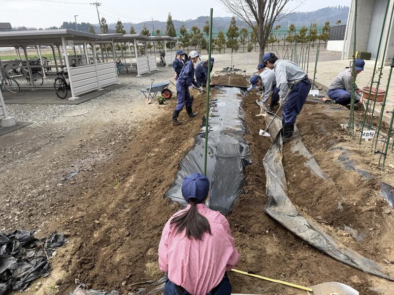 午前中は、天地返し、畝立て、マルチ張りを行いました。協力しながら土を耕し、畝の形を整え、マルチを丁寧に張るなど、今後の栽培に向けた基礎づくりに取り組みました。