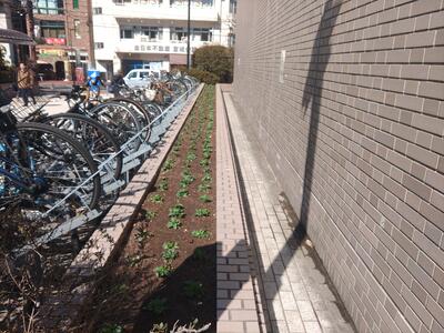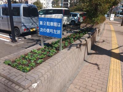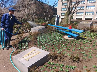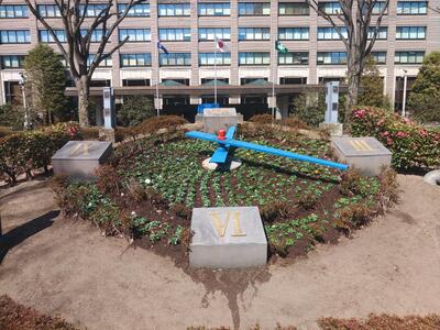 3月12日(木)、草花部門と造園部門の生徒25名が、県庁前の花時計をはじめとする3カ所の花壇において、10月に植えたハボタンをパンジーやビオラへ植え替えました。