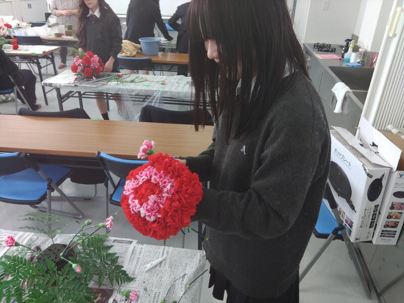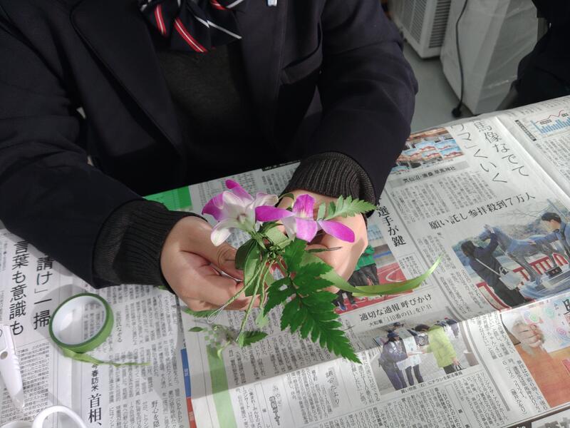 生徒たちは、花材の下処理やフォーカルポイント(中心となる花)の配置などの基本を学びながら進めました。吸水性スポンジの扱い方やワイヤー加工、フローラルテープ巻きなどの細かな作業に苦戦する様子も見られましたが、初めてのアレンジメントでも、一人ひとりが工夫をしながら作品を完成させました。
