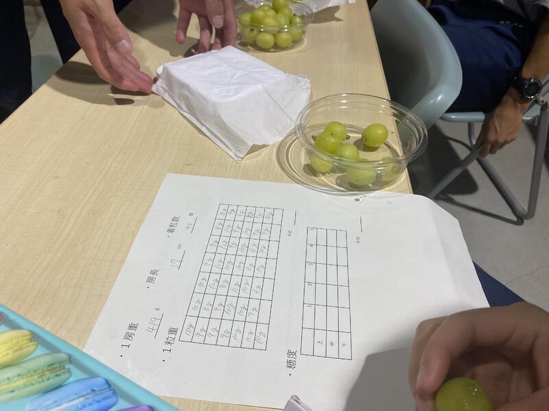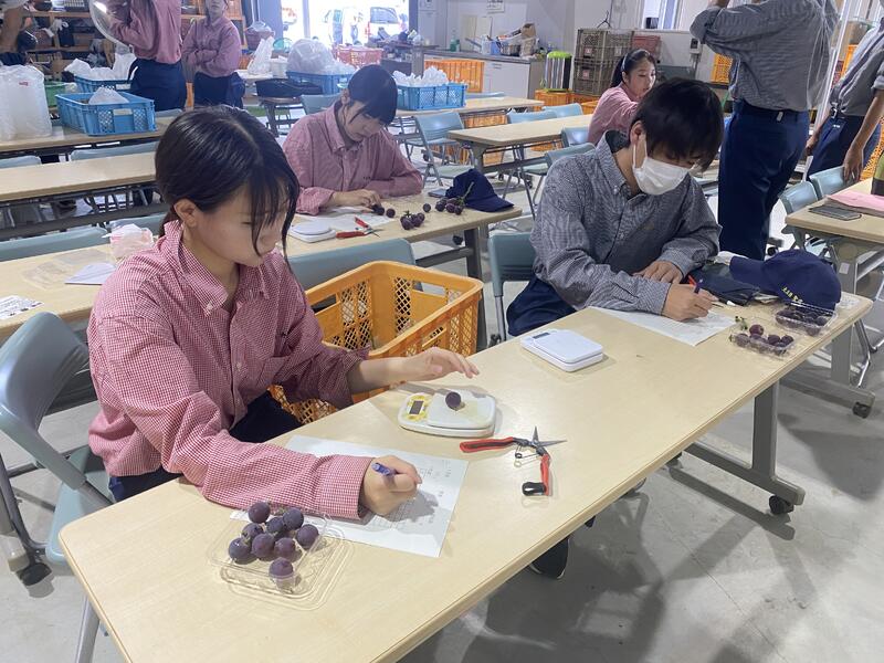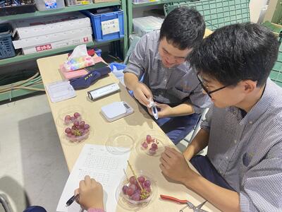 販売を行う前に、ブドウの房から1粒ずつ果実を外して数を数えて重さを測り、