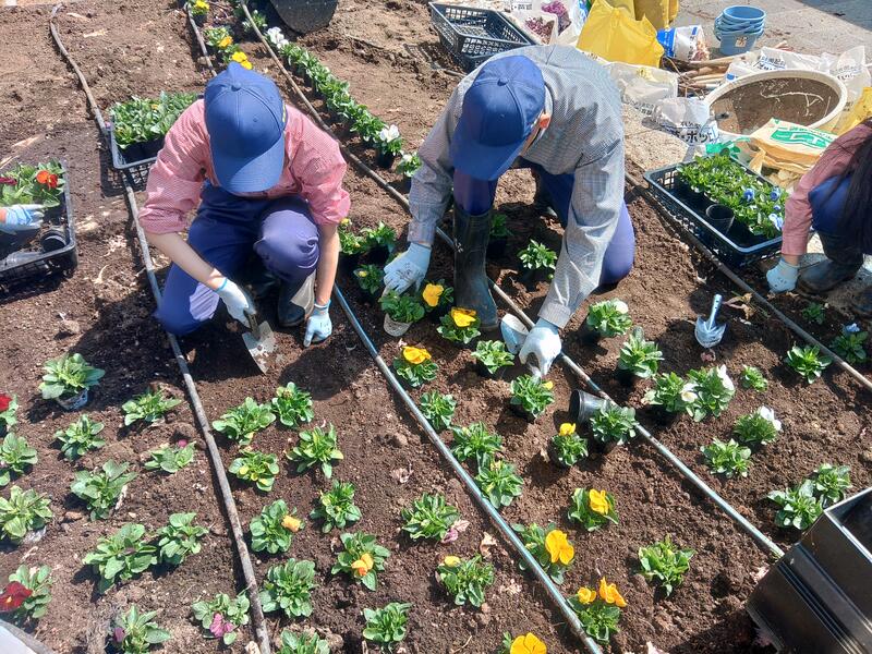 今回は、10月に植えたハボタンから、約1,000株のパンジー・ビオラへと植え替えを行いました。