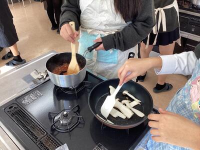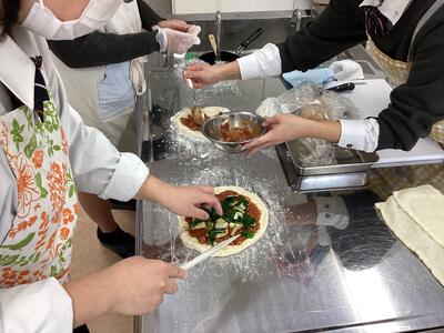 時間の都合上、ピザ生地は仕込んできていただきましたが、生徒たちはソースづくりと成型を行い、チーズをたっぷり載せてオーブンへ!!