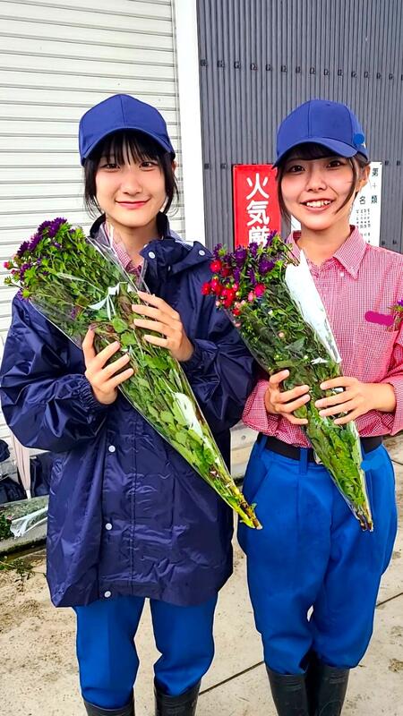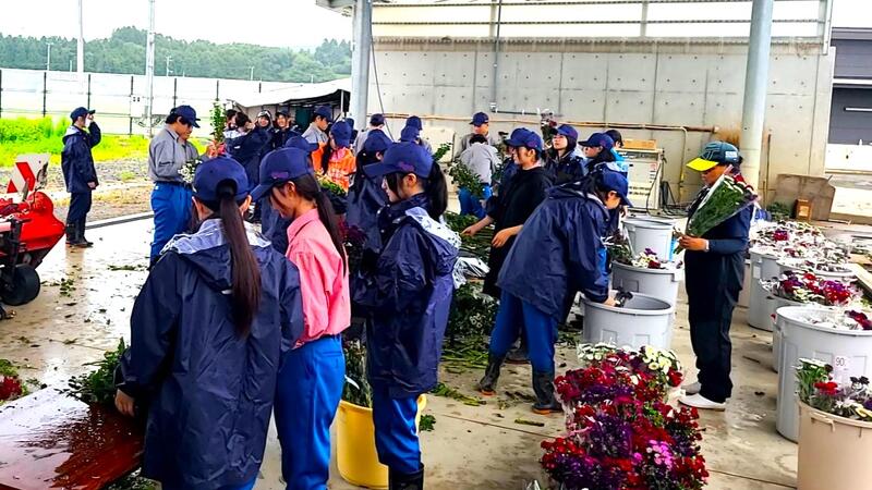 雨降りの実習となりましたが、みんなで協力して収穫と調製、袋詰めを行い、綺麗な花束として販売することができました。