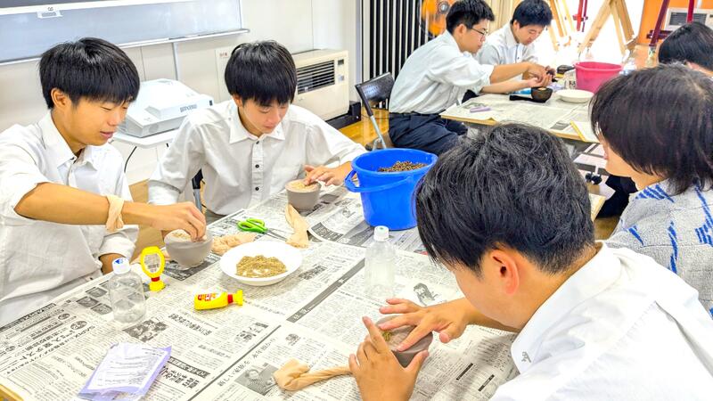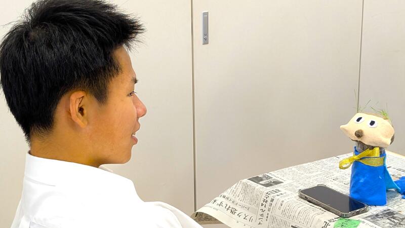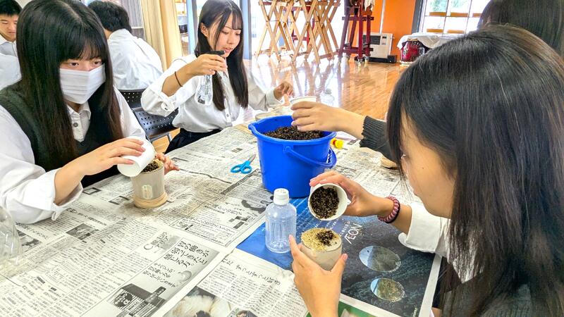 農業科目「生物活用」~園芸を活用しよう編~として、芝(イネ科植物)の種とストッキング、ペットボトルを使って、芝人形を作りました♪