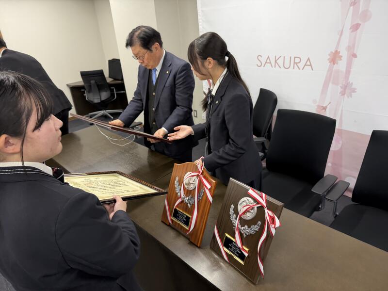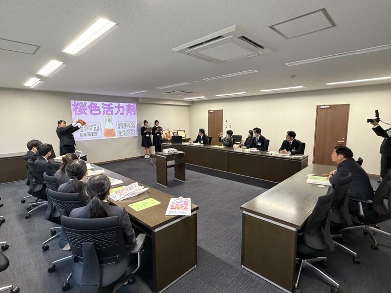 本訪問は、柴田町と連携して取り組んできた桜の保全・研究活動の報告に加え、第76回日本学校農業クラブ全国大会プロジェクト発表会 分野Ⅲ類(資源活用・地域振興)最優秀賞(文部科学大臣賞)、ならびに FFJ検定特級最優秀賞 の受賞報告を兼ねて実施したものです。報告会の冒頭では、これらの受賞について、これまでの地域との協働や取組の積み重ねが評価された成果であることを説明しました。