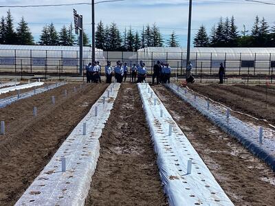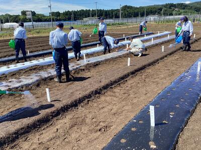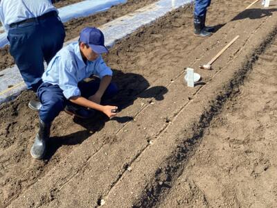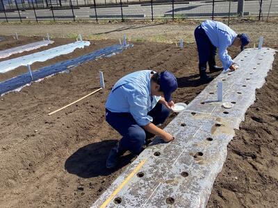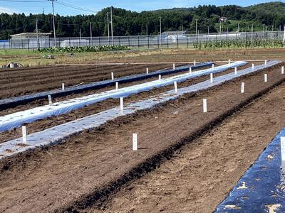 夏休みの実習で、土壌改良剤・基肥を入れ、前回の実習でマルチ