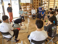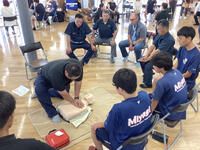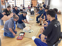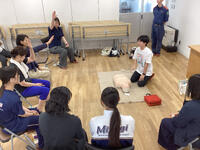 多くの教職員に加えて、部活動のマネージャーを中心に生徒も参加し、命を守るための応急手当やAEDの使用方法などについて学びました。