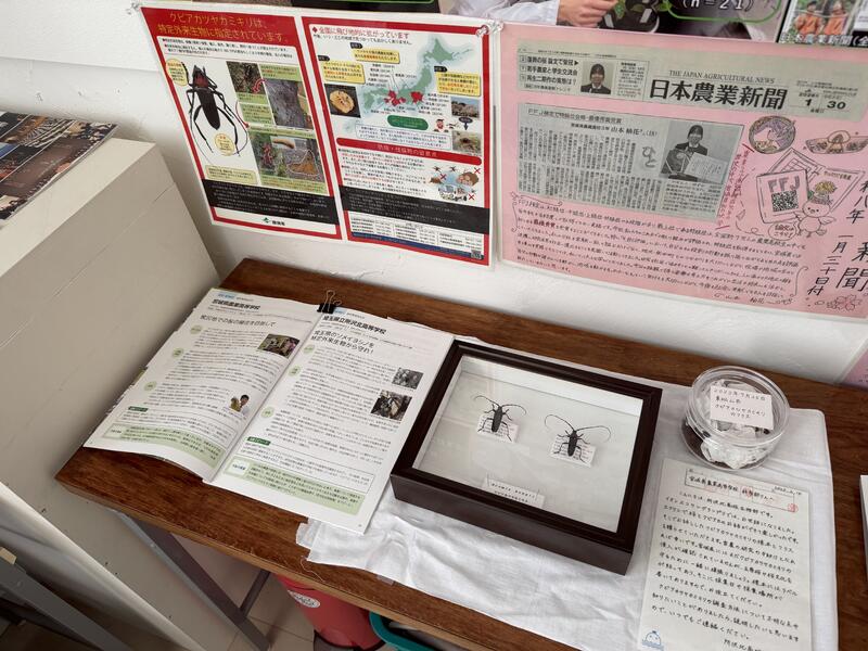 また、桜を愛する人々が集まる場所であることから、埼玉県立所沢北高等学校から提供いただいたクビアカツヤカミキリの標本も展示し、その重要性についての注意喚起を行っています。ぜひ、実物を見に来てください。