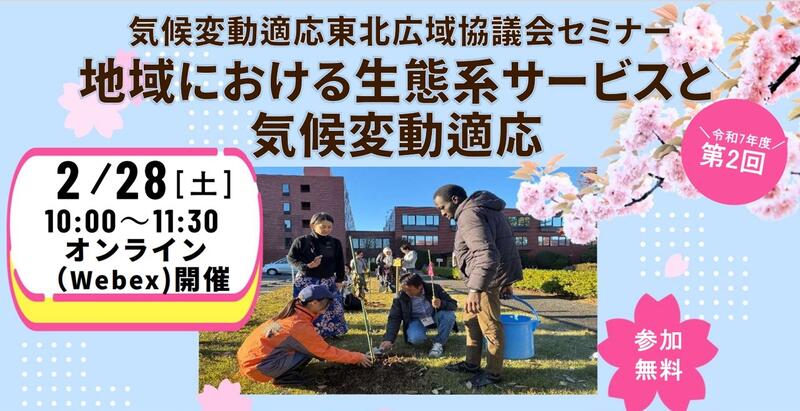 このたび、気候変動適応東北広域協議会(事務局:東北地方環境事務所)主催セミナー「地域における生態系サービスと気候変動適応」において、本校が事例発表を行うこととなりました。本セミナーは、地域における生態系サービスの活用や気候変動適応について考えるオンラインセミナーです。