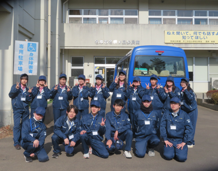 食品化学科では、「総合実習」の授業で製造したリンゴジュースの販売実習を行いました。1年生の前半グループが、名取市名取が丘公民館を中心に、周辺の地域住民の皆様を対象に実施しました。この実習は、食品加工および販売の現場を体験することで、食品化学の知識を実践的に活用する能力を養うことを目的としています。特に、リンゴジュースを製造するにあたり、材料の調整から瓶詰めまで自分たちの手で実施してきました。製造工程から販売までを一貫して行うことで、品質やマーケティング、消費者対応など多様な観点から学びを深めます。当日は、天候にも恵まれ、生徒たちは、自分たちが手作りしたジュースの材料や、100%ジュースを製造する工程で大変だったことを説明し、消費者の皆様との会話を楽しみながら販売することができました。この実習を通して、食品製造の留意点や消費者との接し方、礼儀や姿勢などを学び、とても有意義な時間となりました。