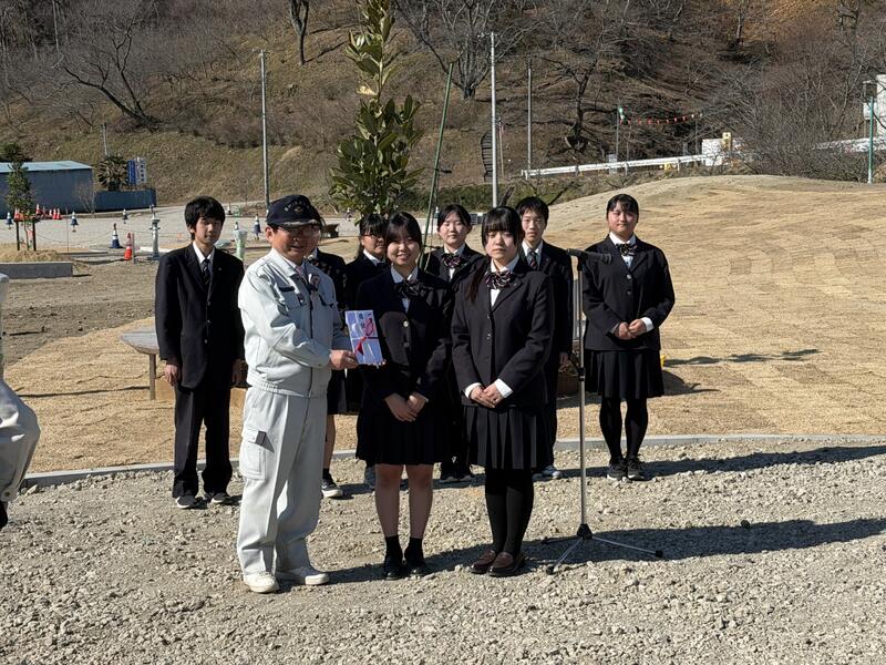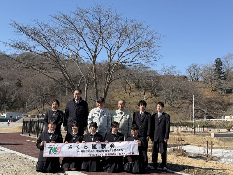 令和8年2月21日(土)、柴田町船岡城址公園「みんなの広場」において、寄付贈呈および記念植樹を実施いたしました。本校は「第15回クボタ・毎日地球未来賞」において大賞を受賞し、賞金50万円を頂戴いたしました。本賞は毎日新聞社主催のもと、地球環境保全に貢献する取組を顕彰するものです。今回、その賞金全額を「桜育成活動等の推進事業費」として柴田町へ寄付させていただきました。